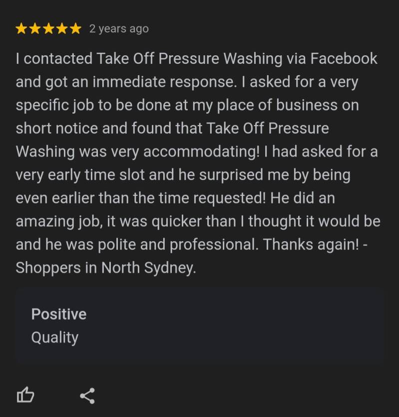 “Take Off Pressure Washing exceeded my expectations! Their team was professional, efficient, and left my home looking brand new. I highly recommend their services!”